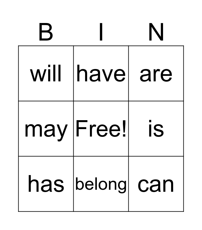 This bingo card has a free space and 8 words: is, are, have, has, will, can, may and belong.