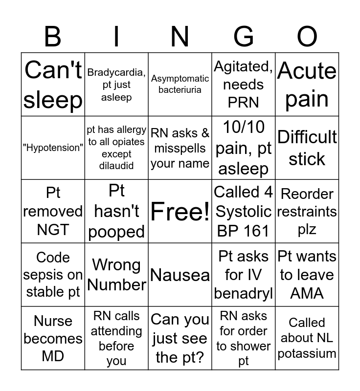 This bingo card has a free space and 24 words: Wrong Number, RN calls attending before you, RN asks & misspells your name, Nurse becomes MD, Acute pain, Can't sleep, "Hypotension", Bradycardia, pt just asleep, Called 4 Systolic BP 161, Nausea, 10/10 pain, pt asleep, Pt removed NGT, Pt asks for IV benadryl, Pt wants to leave AMA, pt has allergy to all opiates except dilaudid, RN asks for order to shower pt, Reorder restraints plz, Asymptomatic bacteriuria, Difficult stick, Pt hasn't pooped, Called about NL potassium, Code sepsis on stable pt, Agitated, needs PRN and Can you just see the pt?.