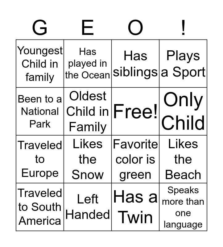 This bingo card has 16 words: Left Handed, Likes the Beach, Has siblings, Youngest Child in family, Traveled to Europe, Has played in the Ocean, Favorite color is green, Has a Twin, Been to a National Park, Oldest Child in Family, Traveled to South America, Plays a Sport, Likes the Snow, Only Child, Free! and Speaks more than one language.