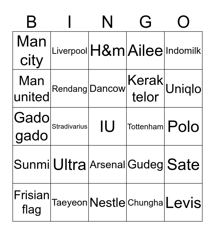 This bingo card has 25 words: Ultra, Nestle, Dancow, Frisian flag, Indomilk, Man city, Man united, Liverpool, Tottenham, Arsenal, Kerak telor, Gado gado, Gudeg, Sate, Rendang, Levis, Polo, H&m, Uniqlo, Stradivarius, IU, Taeyeon, Sunmi, Ailee and Chungha.