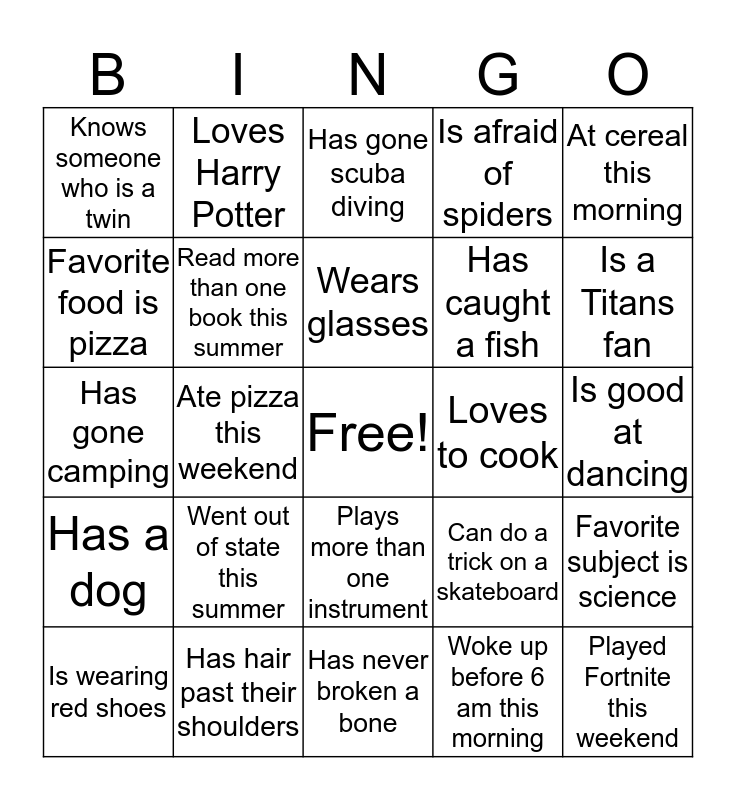 This bingo card has a free space and 24 words: Went out of state this summer, Has hair past their shoulders, Wears glasses, Is wearing red shoes, At cereal this morning, Knows someone who is a twin, Favorite food is pizza, Loves Harry Potter, Loves to cook, Plays more than one instrument, Has caught a fish, Has gone camping, Can do a trick on a skateboard, Favorite subject is science, Read more than one book this summer, Woke up before 6 am this morning, Is good at dancing, Has gone scuba diving, Is a Titans fan, Ate pizza this weekend, Played Fortnite this weekend, Has a dog, Is afraid of spiders and Has never broken a bone.