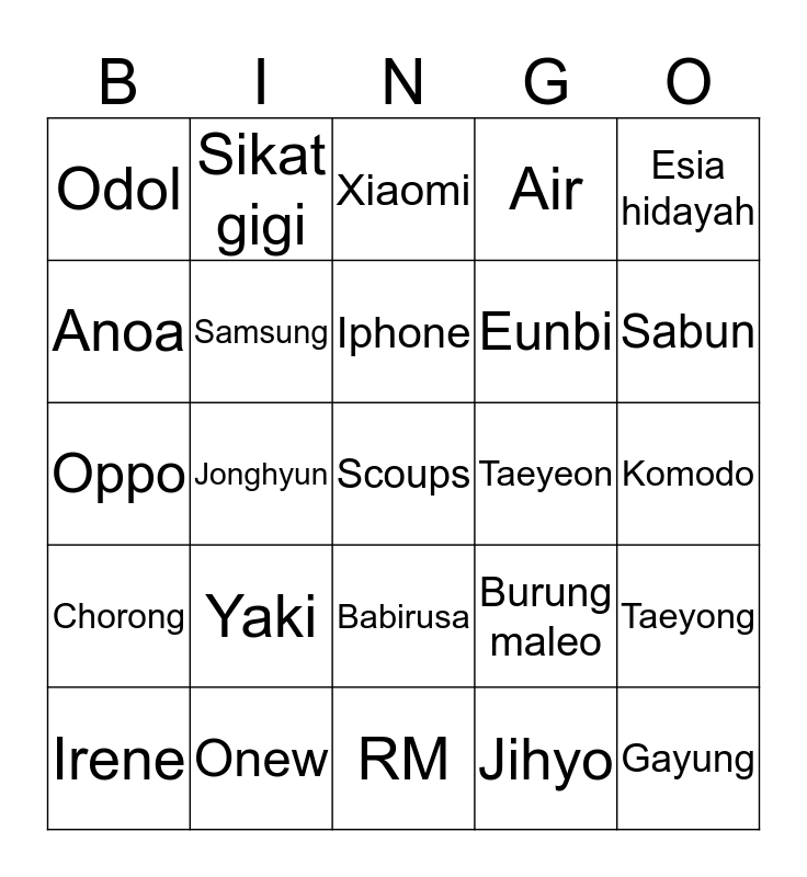 This bingo card has a free space and 24 words: Yaki, Onew, Iphone, Irene, Esia hidayah, Odol, Anoa, Sikat gigi, Taeyeon, Babirusa, Eunbi, Oppo, Burung maleo, Taeyong, Samsung, Jihyo, Komodo, Xiaomi, Sabun, Jonghyun, Gayung, Chorong, Air and RM.