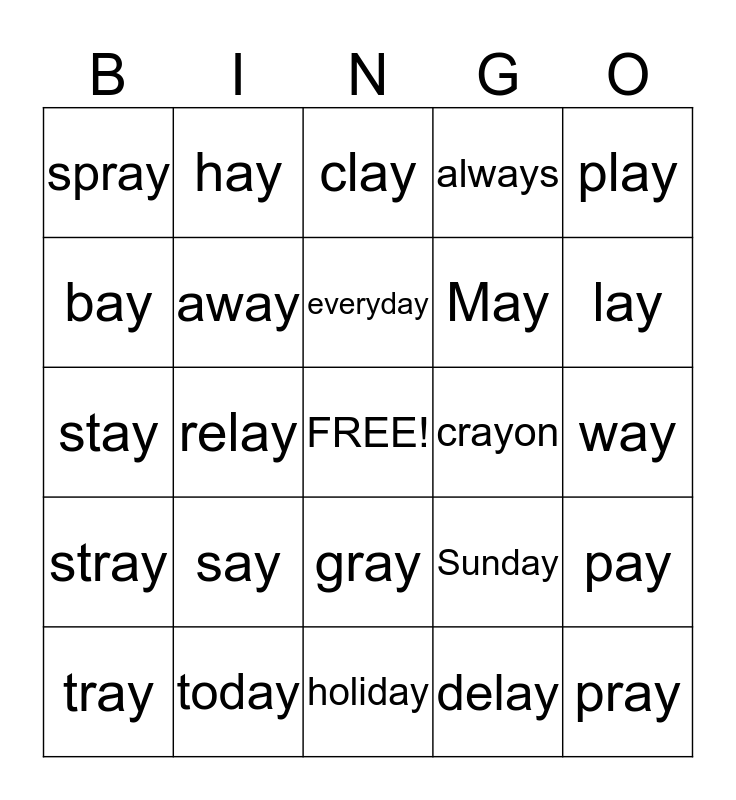 This bingo card has a free space and 24 words: say, today, everyday, tray, play, spray, bay, hay, crayon, gray, May, stay, Sunday, pay, away, delay, way, clay, lay, relay, pray, stray, always and holiday.