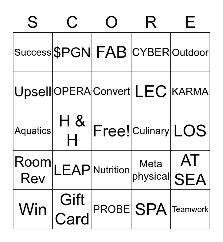 This bingo card has a free space and 24 words: LEAP, Gift Card, Convert, Win, Outdoor, Success, Upsell, $PGN, Culinary, Nutrition, LEC, Aquatics, Meta physical, AT SEA, OPERA, SPA, LOS, FAB, KARMA, H & H, Teamwork, Room Rev, CYBER and PROBE.