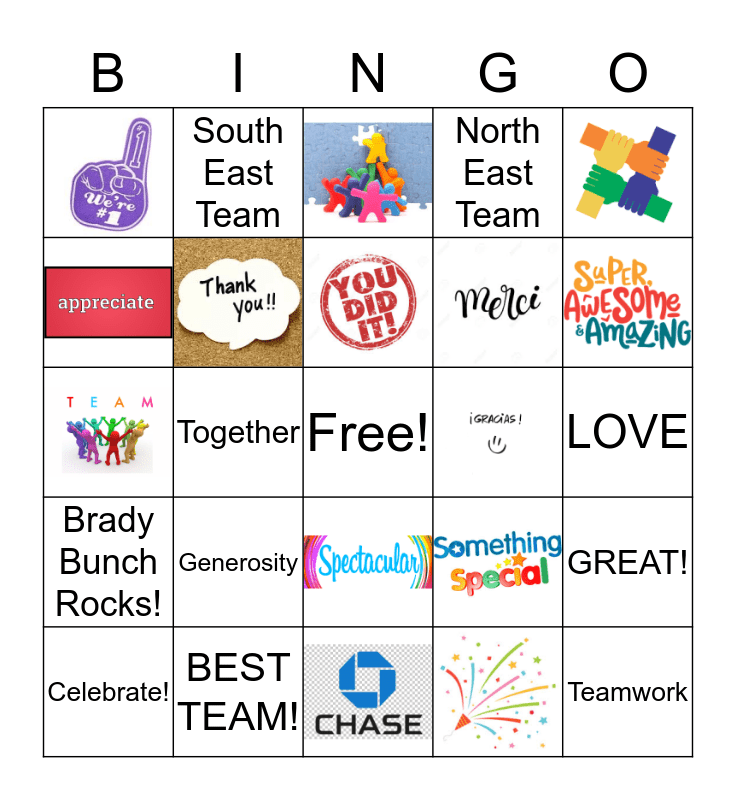 This bingo card has 17 images, a free space and 12 words: Celebrate!, Together, We are UNITED!, Generosity, BEST TEAM!, LOVE, Teamwork, Loyal, Brady Bunch Rocks!, North East Team, South East Team and GREAT!.