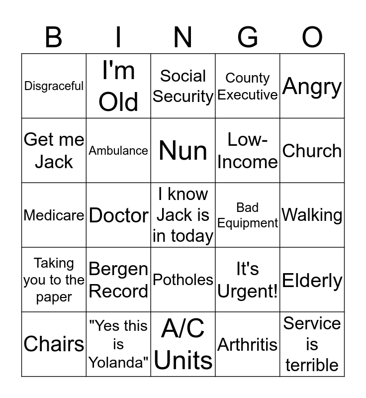 This bingo card has 25 words: Bergen Record, A/C Units, Nun, Chairs, Angry, Disgraceful, Get me Jack, I'm Old, Bad Equipment, Potholes, Low-Income, Medicare, It's Urgent!, Elderly, Ambulance, Service is terrible, Walking, Social Security, Church, Doctor, I know Jack is in today, "Yes this is Yolanda", Taking you to the paper, County Executive and Arthritis.