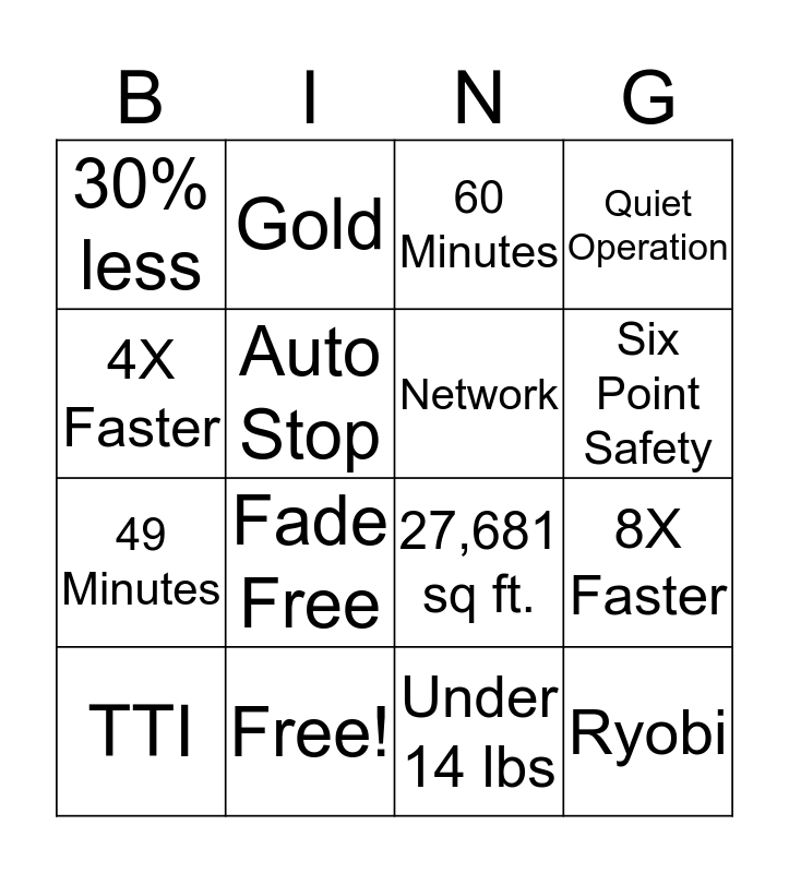 This bingo card has 16 words: Free!, 8X Faster, 60 Minutes, 30% less, 49 Minutes, Gold, 27,681 sq ft., Under 14 lbs, 4X Faster, Auto Stop, TTI, Quiet Operation, Fade Free, Six Point Safety, Network and Ryobi.