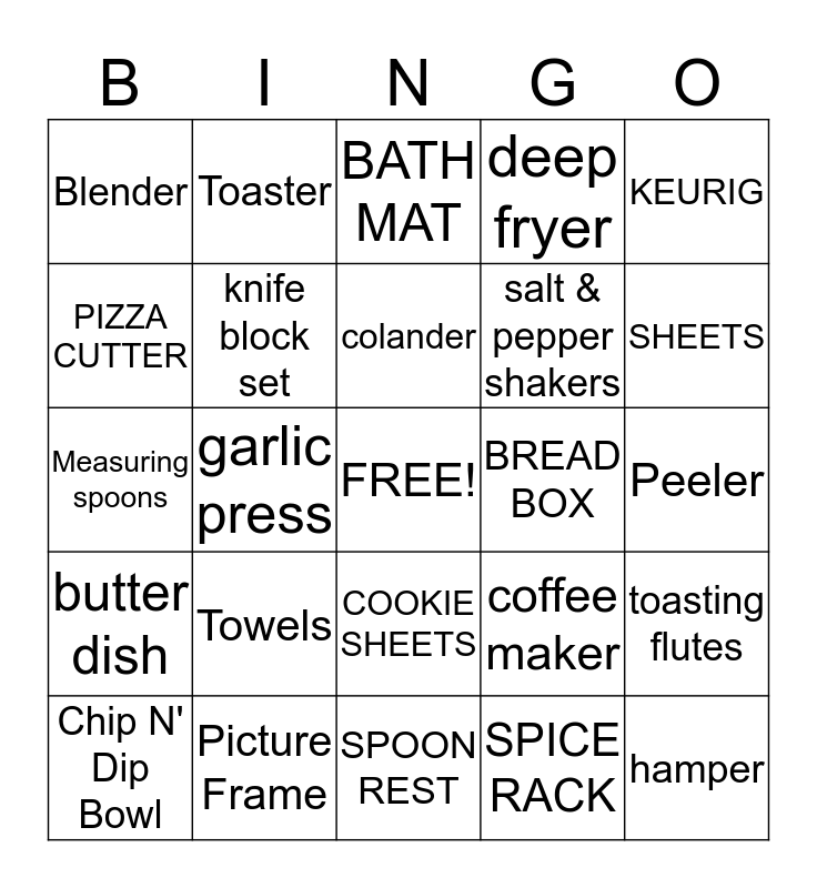 This bingo card has a free space and 24 words: Towels, Picture Frame, colander, Chip N' Dip Bowl, KEURIG, Blender, PIZZA CUTTER, Toaster, BREAD BOX, COOKIE SHEETS, salt & pepper shakers, Measuring spoons, coffee maker, toasting flutes, knife block set, SPICE RACK, Peeler, BATH MAT, SHEETS, garlic press, hamper, butter dish, deep fryer and SPOON REST.