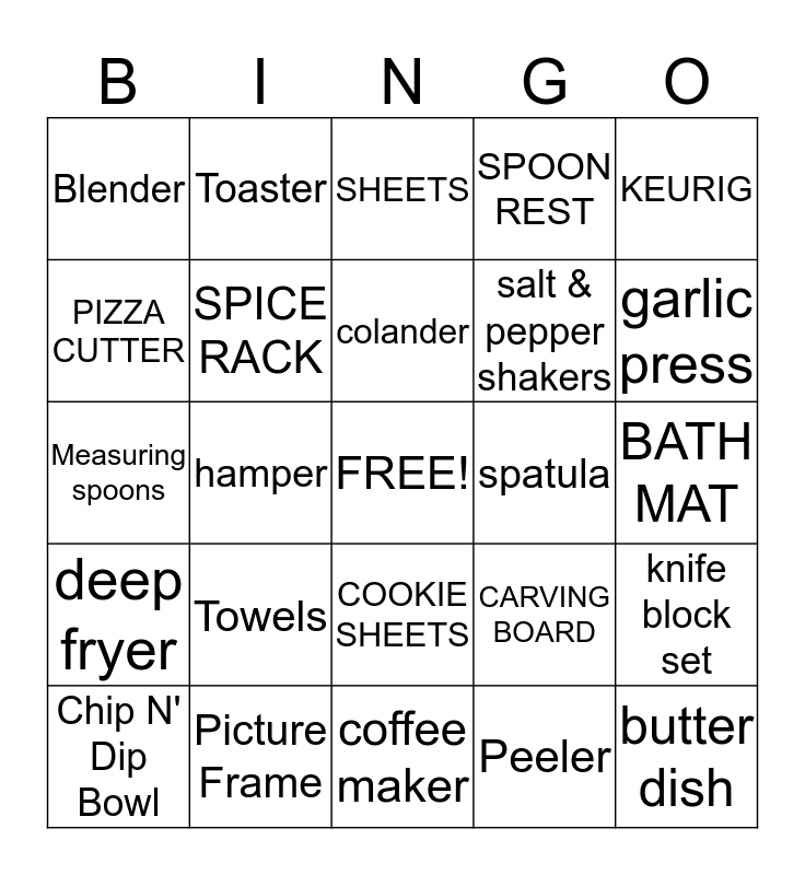 This bingo card has a free space and 24 words: Towels, Picture Frame, colander, Chip N' Dip Bowl, KEURIG, Blender, PIZZA CUTTER, Toaster, spatula, COOKIE SHEETS, salt & pepper shakers, Measuring spoons, CARVING BOARD, knife block set, SPICE RACK, Peeler, BATH MAT, SHEETS, garlic press, hamper, butter dish, deep fryer, SPOON REST and coffee maker.