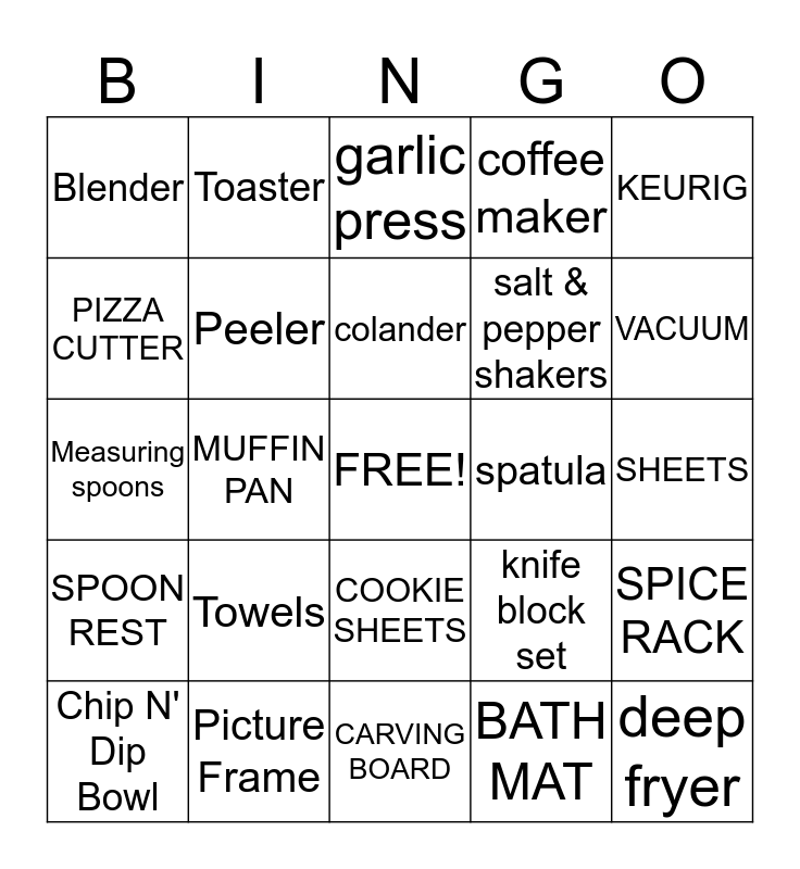 This bingo card has a free space and 24 words: Towels, Picture Frame, colander, Chip N' Dip Bowl, KEURIG, Blender, PIZZA CUTTER, Toaster, spatula, COOKIE SHEETS, salt & pepper shakers, Measuring spoons, knife block set, SPICE RACK, Peeler, BATH MAT, SHEETS, garlic press, VACUUM, MUFFIN PAN, deep fryer, SPOON REST, coffee maker and CARVING BOARD.