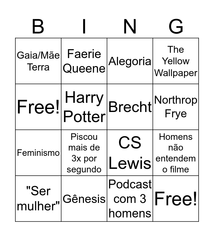 This bingo card has 16 words: Gênesis, Homens não entendem o filme, Alegoria, Gaia/Mãe Terra, Feminismo, Faerie Queene, CS Lewis, Podcast com 3 homens, Free!, Harry Potter, "Ser mulher", The Yellow Wallpaper, Piscou mais de 3x por segundo, Northrop Frye, Brecht and Free!.