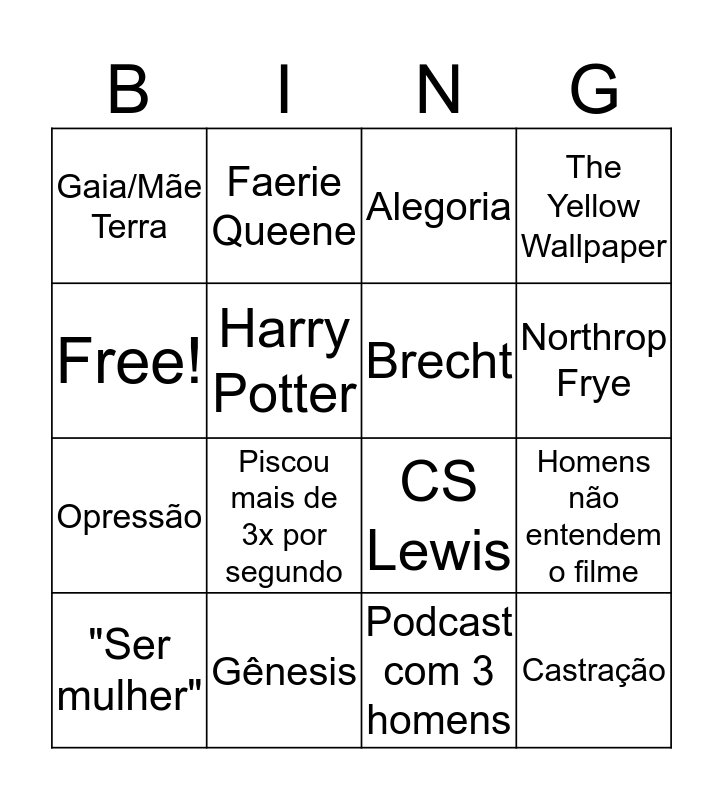 This bingo card has 16 words: Gênesis, Homens não entendem o filme, Alegoria, Gaia/Mãe Terra, Opressão, Faerie Queene, CS Lewis, Podcast com 3 homens, Free!, Harry Potter, "Ser mulher", The Yellow Wallpaper, Piscou mais de 3x por segundo, Northrop Frye, Brecht and Castração.