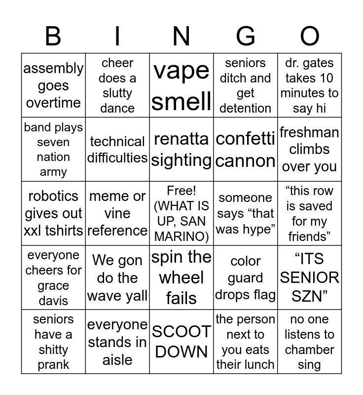 This bingo card has a free space and 24 words: We gon do the wave yall, everyone stands in aisle, renatta sighting, seniors have a shitty prank, dr. gates takes 10 minutes to say hi, assembly goes overtime, band plays seven nation army, cheer does a slutty dance, someone says “that was hype”, spin the wheel fails, confetti cannon, robotics gives out xxl tshirts, color guard drops flag, “ITS SENIOR SZN”, technical difficulties, the person next to you eats their lunch, “this row is saved for my friends”, vape smell, freshman climbs over you, meme or vine reference, no one listens to chamber sing, everyone cheers for grace davis, seniors ditch and get detention and SCOOT DOWN.