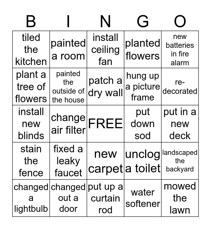 This bingo card has a free space and 24 words: fixed a leaky faucet, changed out a door, patch a dry wall, changed a lightbulb, new batteries in fire alarm, tiled the kitchen, plant a tree of flowers, painted a room, put down sod, new carpet, hung up a picture frame, install new blinds, unclog a toilet, landscaped the backyard, painted the outside of the house, water softener, put in a new deck, install ceiling fan, re-decorated, change air filter, mowed the lawn, stain the fence, planted flowers and put up a curtain rod.