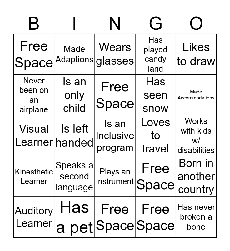 This bingo card has a free space and 24 words: Speaks a second language, Has a pet, Free Space, Auditory Learner, Likes to draw, Free Space, Never been on an airplane, Made Adaptions, Loves to travel, Plays an instrument, Has seen snow, Visual Learner, Free Space, Born in another country, Is an only child, Free Space, Works with kids w/ disabilities, Wears glasses, Made Accommodations, Is left handed, Has never broken a bone, Kinesthetic Learner, Has played candy land and Free Space.