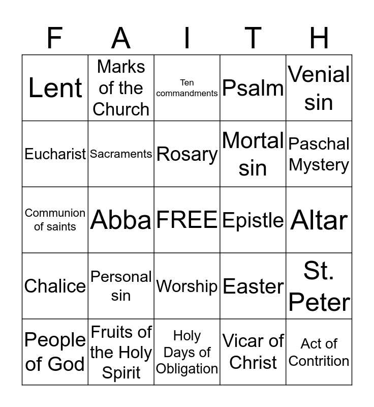 This bingo card has a free space and 24 words: Personal sin, Fruits of the Holy Spirit, Rosary, People of God, Venial sin, Lent, Eucharist, Marks of the Church, Epistle, Worship, Mortal sin, Communion of saints, Easter, St. Peter, Sacraments, Vicar of Christ, Altar, Ten commandments, Paschal Mystery, Abba, Act of Contrition, Chalice, Psalm and Holy Days of Obligation.