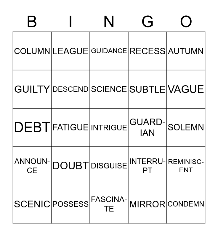 This bingo card has 25 words: DOUBT, FASCINA- TE, SCIENCE, SCENIC, AUTUMN, COLUMN, GUILTY, LEAGUE, GUARD- IAN, DISGUISE, SUBTLE, DEBT, INTERRU- PT, REMINISC- ENT, DESCEND, CONDEMN, SOLEMN, GUIDANCE, VAGUE, FATIGUE, INTRIGUE, POSSESS, ANNOUN- CE, RECESS and MIRROR.