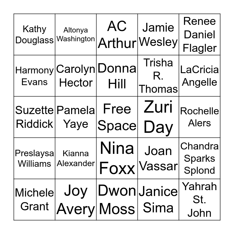 This bingo card has a free space and 24 words: Kianna Alexander, Joy Avery, Donna Hill, Michele Grant, Renee Daniel Flagler, Kathy Douglass, Harmony Evans, Altonya Washington, Zuri Day, Nina Foxx, Trisha R. Thomas, Suzette Riddick, Joan Vassar, Chandra Sparks Splond, Carolyn Hector, Janice Sima, Rochelle Alers, AC Arthur, LaCricia Angelle, Pamela Yaye, Yahrah St. John, Preslaysa Williams, Jamie Wesley and Dwon Moss.