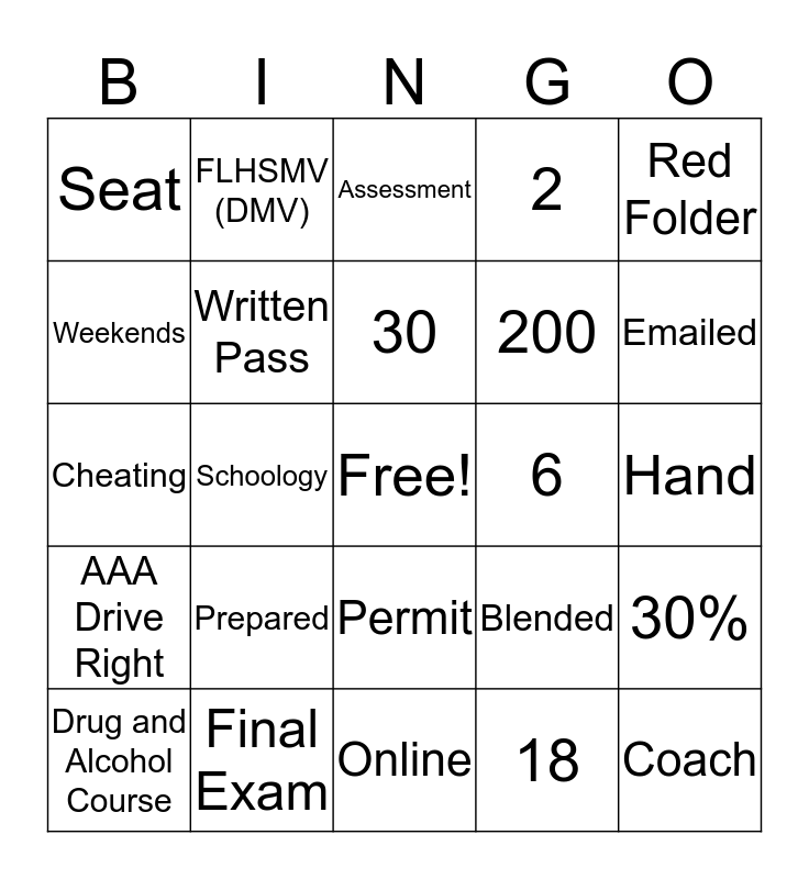 This bingo card has a free space and 27 words: Blended, Behind the wheel driving, 200, Online, Weekends, Assessment, FLHSMV (DMV), AAA Drive Right, 6, 30%, Cheating, 2, Drug and Alcohol Course, Final Exam, Emailed, Discount, Written Pass, 30, Prepared, Seat, Hand, 18, Schoology, Coach, Permit, Red Folder and Florida Drivers Manual.