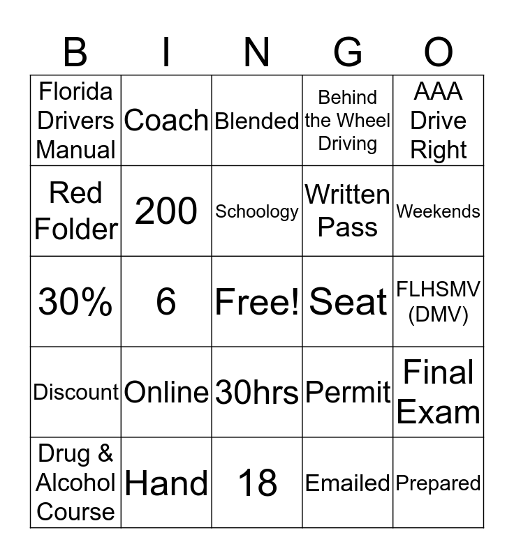 This bingo card has a free space and 27 words: Permit, 2, Written Pass, 18, Red Folder, Blended, Coach, Discount, Seat, Final Exam, 30%, Behind the Wheel Driving, Drug & Alcohol Course, Hand, Weekends, Cheating, 200, Schoology, Online, Florida Drivers Manual, FLHSMV (DMV), Emailed, 6, Prepared, 30hrs, AAA Drive Right and Assessment.