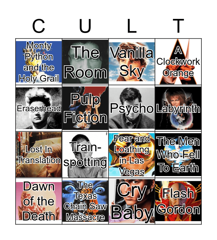 This bingo card has 35 images and 35 words: Rocky Picture Horror Show, Donnie Darko, Fight Club, Psycho, Heavy Metal, A Clockwork Orange, Pulp Fiction, The Big Lebowski, Labyrinth, Pink Flamingos, Fear and Loathing in Las Vegas, Eraserhead, Kill Bill, Hedwig and the Angry Inch, Monty Python and the Holy Grail, The Texas Chain Saw Massacre, Barbarella, The Men Who Fell To Earth, Flash Gordon, Dawn of the Death, The Elephant Man, Killer Clowns fromOuter Space, Video-drome, The Shining, Vanilla Sky, Train- spotting, Pi, Oldboy, Lost In Translation, Cry Baby, Altered States, The Thing, Twin Peaks, The Room and Dogtooth.