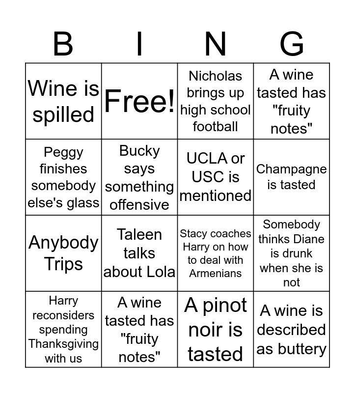This bingo card has 19 words: Stacy coaches Harry on how to deal with Armenians, Diane makes a joke that falls flat, Nicholas brings up high school football, A wine is described as buttery, Somebody thinks Diane is drunk when she is not, Peggy finishes somebody else's glass, A pinot noir is tasted, Wine is spilled, Free!, Anybody Trips, Taleen talks about Lola, Bucky says something offensive, UCLA or USC is mentioned, A wine tasted has "fruity notes", Harry reconsiders spending Thanksgiving with us, Catherine finishes somebody else's food, A wine tasted has "fruity notes", Champagne is tasted and Chuck makes a joke that falls flat.