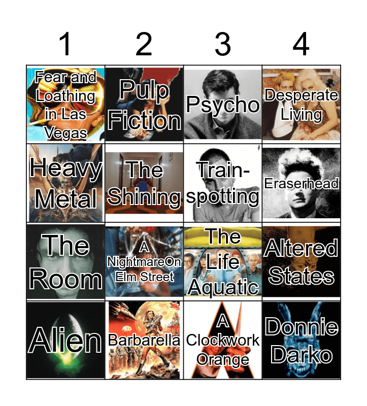 This bingo card has 27 images and 27 words: Monty Python and the Holy Grail, Killer Clowns fromOuter Space, The Room, Dogtooth, The Shining, Psycho, Pulp Fiction, Donnie Darko, Barbarella, The Big Lebowski, The Life Aquatic, Desperate Living, Edward Scissor-hands, Escape from New York, A NightmareOn Elm Street, Jaws, Train- spotting, Eraserhead, Pink Flamingos, Fear and Loathing in Las Vegas, A Clockwork Orange, The Doom Generation, Altered States, Alien, The Breakfast Club, Heavy Metal and The Rocky Picture Horror Show.