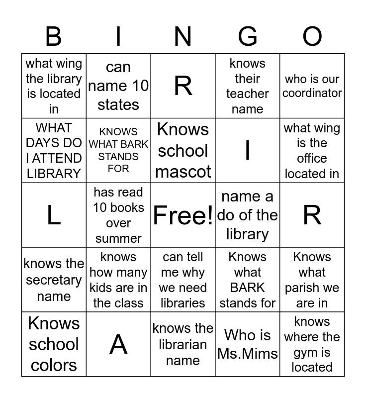 This bingo card has a free space and 28 words: Knows school colors, B, Knows school mascot, Who is Ms.Mims, who is our coordinator, what wing the library is located in, can name 10 states, knows the librarian name, I, Knows what parish we are in, L, KNOWS WHAT BARK STANDS FOR, Knows what BARK stands for, Visited my neighborhood library, has read 10 books over summer, name at least one type of genre, name a do of the library, what wing is the office located in, WHAT DAYS DO I ATTEND LIBRARY, A, R, Y, R, knows the secretary name, knows how many kids are in the class, can tell me why we need libraries, knows their teacher name and knows where the gym is located.