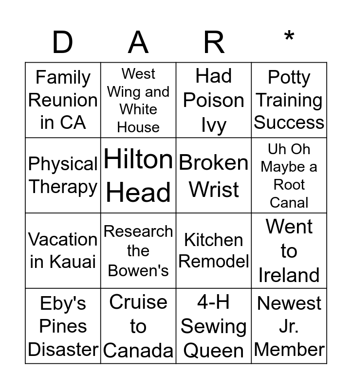 This bingo card has 16 words: Cruise to Canada, Went to Ireland, Had Poison Ivy, Family Reunion in CA, Vacation in Kauai, West Wing and White House, Kitchen Remodel, 4-H Sewing Queen, Physical Therapy, Hilton Head, Eby's Pines Disaster, Potty Training Success, Research the Bowen's, Uh Oh Maybe a Root Canal, Broken Wrist and Newest Jr. Member.