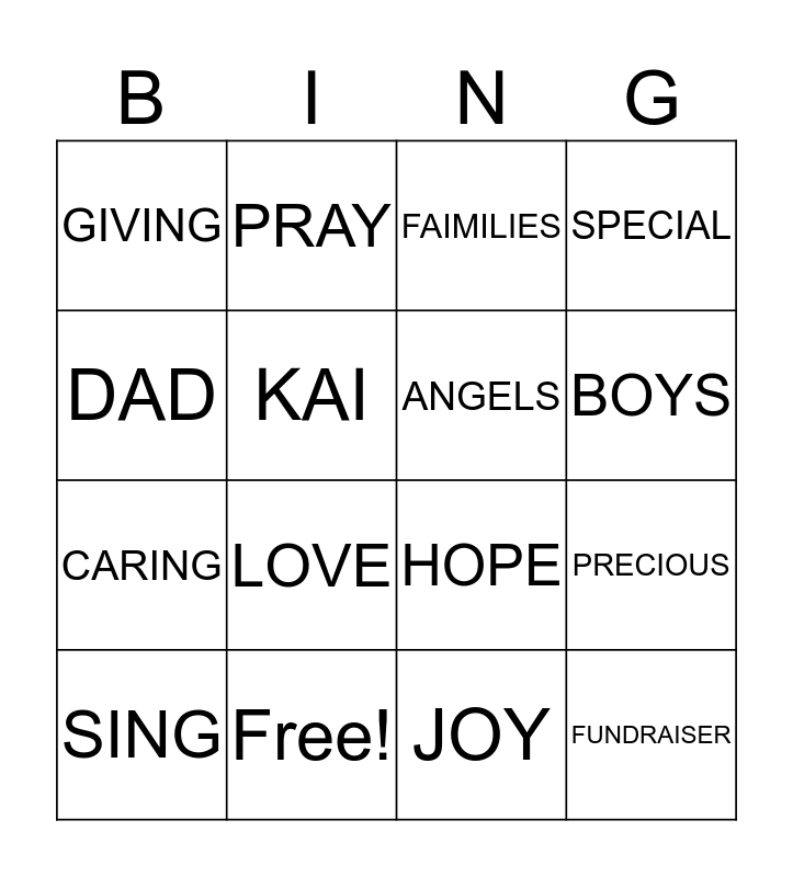 This bingo card has 28 words: AMAZING, GENEROUS, CARING, CHILDREN, KAI, FAIMILIES, PRAY, FUNDRAISER, Free!, HAPPY, HOPE, SPECIAL, BEAUTIFUL, NURSES, LOVE, CHARITY, SAFE, ANGELS, BOYS, GIRLS, GIVING, DANCE, SING, PRECIOUS, JOY, MUM, DAD and DARLINGS.