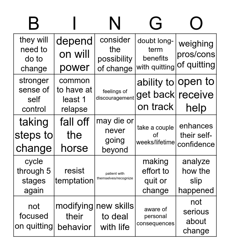 This bingo card has a free space and 44 words: defend their current bad habit, not serious about change, don't feel like it's a problem, not focused on quitting, defensive in their bad habit, aware of personal consequences, consider the possibility of change, people are on a teeter-totter, weighing pros/cons of quitting, modifying their behavior, doubt long-term benefits with quitting, take a couple of weeks/lifetime, patient with themselves/recognize, resist temptation, stay on track, new skills to deal with life, avoid relapse, taking steps to change, seek support with others, open to receive help, depend on will power, gather information, motivation for change, they will need to do to change, maintain the new status, enhances their self-confidence, I've got to do something about this, shortest of all stages, making effort to quit or change, cycle through 5 stages again, undermine their self-confidence, analyze how the slip happened, opportunity to learn and be stronger, learn to anticipate high-risk situation, fall off the horse, control environmental cues that tempt, immediate sense of failure, do not follow a straight path, feelings of discouragement, stronger sense of self control, ability to get back on track, opportunity to cope differently, common to have at least 1 relapse and termination ending.