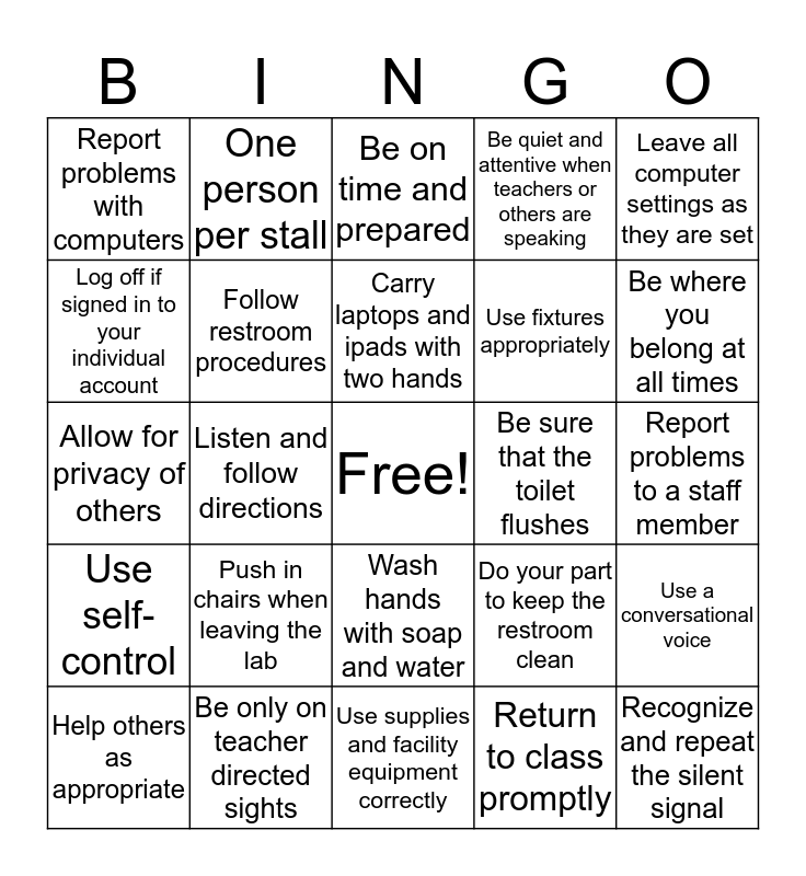 This bingo card has a free space and 24 words: Push in chairs when leaving the lab, Be only on teacher directed sights, Carry laptops and ipads with two hands, Help others as appropriate, Leave all computer settings as they are set, Report problems with computers, Log off if signed in to your individual account, One person per stall, Be sure that the toilet flushes, Wash hands with soap and water, Use fixtures appropriately, Allow for privacy of others, Do your part to keep the restroom clean, Use a conversational voice, Follow restroom procedures, Return to class promptly, Report problems to a staff member, Be on time and prepared, Be where you belong at all times, Listen and follow directions, Recognize and repeat the silent signal, Use self-control, Be quiet and attentive when teachers or others are speaking and Use supplies and facility equipment correctly.