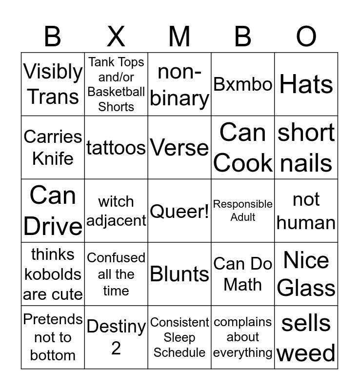 This bingo card has a free space and 24 words: Confused all the time, Destiny 2, Verse, Pretends not to bottom, Hats, Visibly Trans, Carries Knife, Tank Tops and/or Basketball Shorts, Responsible Adult, Blunts, Can Cook, Can Drive, Can Do Math, Nice Glass, tattoos, complains about everything, not human, non-binary, short nails, witch adjacent, sells weed, thinks kobolds are cute, Bxmbo and Consistent Sleep Schedule.