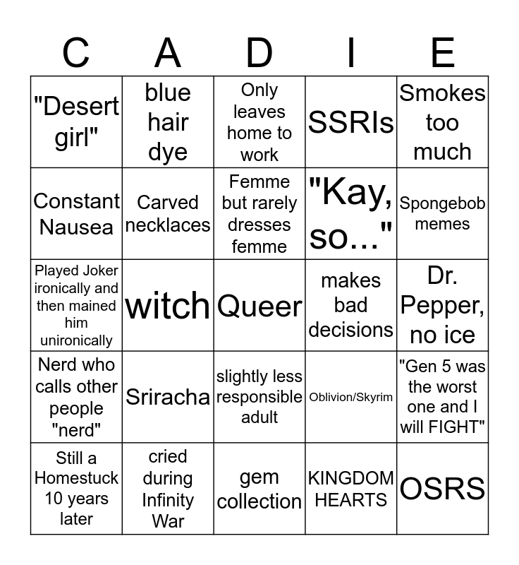 This bingo card has a free space and 24 words: Sriracha, cried during Infinity War, Femme but rarely dresses femme, Still a Homestuck 10 years later, Smokes too much, "Desert girl", Constant Nausea, blue hair dye, makes bad decisions, slightly less responsible adult, "Kay, so...", Played Joker ironically and then mained him unironically, Oblivion/Skyrim, "Gen 5 was the worst one and I will FIGHT", Carved necklaces, KINGDOM HEARTS, Dr. Pepper, no ice, Only leaves home to work, Spongebob memes, witch, OSRS, Nerd who calls other people "nerd", SSRIs and gem collection.
