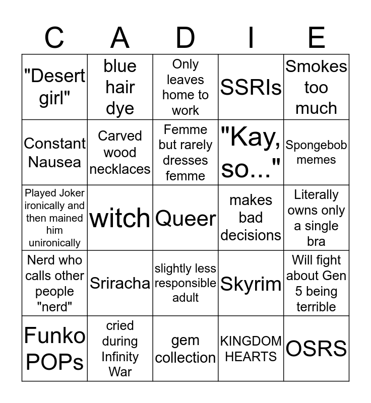 This bingo card has a free space and 24 words: Sriracha, cried during Infinity War, Femme but rarely dresses femme, Funko POPs, Smokes too much, "Desert girl", Constant Nausea, blue hair dye, makes bad decisions, slightly less responsible adult, "Kay, so...", Played Joker ironically and then mained him unironically, Skyrim, Will fight about Gen 5 being terrible, Carved wood necklaces, KINGDOM HEARTS, Literally owns only a single bra, Only leaves home to work, Spongebob memes, witch, OSRS, Nerd who calls other people "nerd", SSRIs and gem collection.