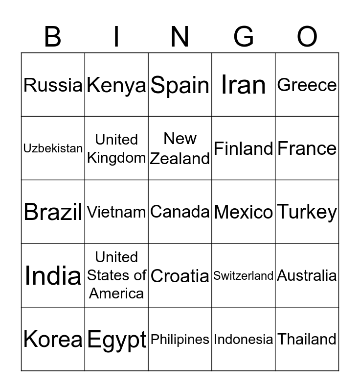 This bingo card has a free space and 29 words: Korea, South Africa, Vietnam, China, Russia, Spain, United Kingdom, United States of America, Mexico, Egypt, Turkey, Thailand, Philipines, Indonesia, France, Italy, Croatia, India, Greece, Brazil, Switzerland, Sweden, Finland, Uzbekistan, Iran, Kenya, Australia, New Zealand and Fiji.