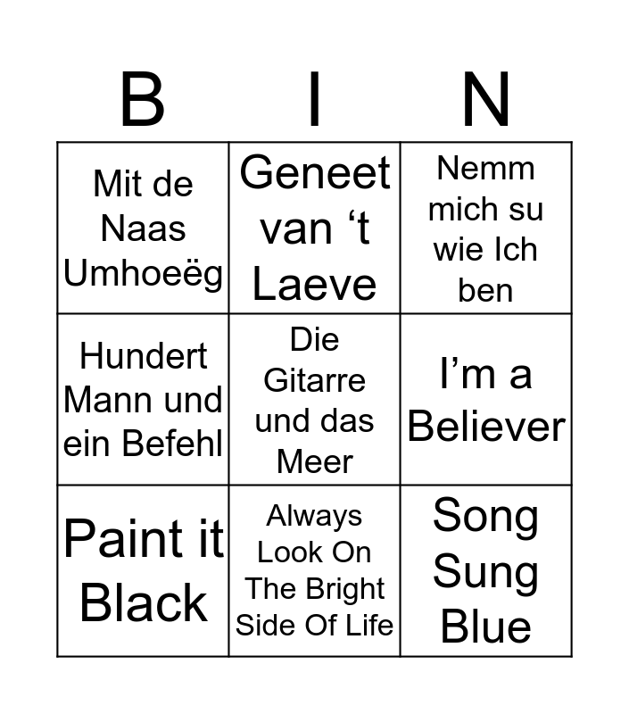 This bingo card has 44 words: An der Nordseeküste, Denn wenn et Trömmelche jeht, D’r Sjunste Koeër, Länger, Echte Fründe, Hey Kölle, Nemm mich su wie Ich ben, Junge, komm bald wieder, Die Gitarre und das Meer, Heimweh, Hundert Mann und ein Befehl, Tanze mit mir in den Morgen, Du kannst nicht immer 17 sein, Du schwarzer Zigeuner, Glück Auf, der Steiger kommt, Tango Medley, Flieger-Marsch, Marmor Stein und Eisen, Kirchroa, ʼt Dörp, Geneet van ‘t Laeve, Los ‘t zieë, ʼt sjunste óp de Welt, Mit de Naas Umhoeëg, Koele en Kuulkes, De Klokke van de Lambeëtus, Droomland, Het Dorp, Het Piemellied, Jan Klaassen de Trompetter, Land van Maas en Waal, Zeven Dagen Lang, Iedereen is van de wereld, Hormonen, Hallelujah, Piano Man, Beautiful Noise, Sweet Caroline, Always Look On The Bright Side Of Life, I’m a Believer, Song Sung Blue, The Sound of Silence, Paint it Black and The Last Time.