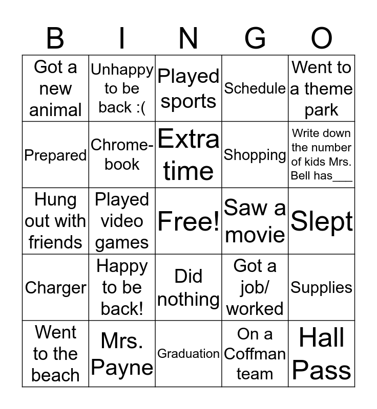 This bingo card has a free space and 29 words: Went to the beach, Cell Phone, Played video games, Family, Got a new animal, Played sports, Chrome-book, Happy to be back!, Saw a movie, Mrs. Payne, Slept, Hall Pass, Graduation, On a Coffman team, Write down the number of kids Mrs. Bell has___, Traveled outside of the country, Did nothing, Charger, Went to a theme park, Hung out with friends, Got a job/ worked, Went to the pool, Shopping, Prepared, Schedule, Unhappy to be back :(, Supplies, Extra time and Respect.