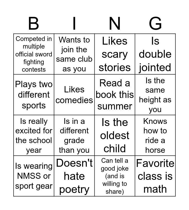 This bingo card has 19 words: Is the oldest child, Is the youngest child, Likes scary stories, Favorite class is math, Knows how to ride a horse, Plays two different sports, Can tell a good joke (and is willing to share), Competed in multiple official sword fighting contests, Wants to join the same club as you, Is really excited for the school year, Is in a different grade than you, Likes comedies, Read a book this summer, Doesn't hate poetry, Is wearing NMSS or sport gear, Likes the same sport team as you, Is double jointed, Is the same height as you and Likes happy endings.