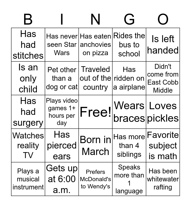 This bingo card has a free space and 24 words: Has pierced ears, Gets up at 6:00 a.m., Traveled out of the country, Plays a musical instrument, Is left handed, Has had stitches, Is an only child, Has never seen Star Wars, Wears braces, Born in March, Has ridden on a airplane, Has had surgery, Has more than 4 siblings, Favorite subject is math, Pet other than a dog or cat, Speaks more than 1 language, Loves pickles, Has eaten anchovies on pizza, Didn't come from East Cobb Middle, Plays video games 1+ hours per day, Has been whitewater rafting, Watches reality TV, Rides the bus to school and Prefers McDonald's to Wendy's.