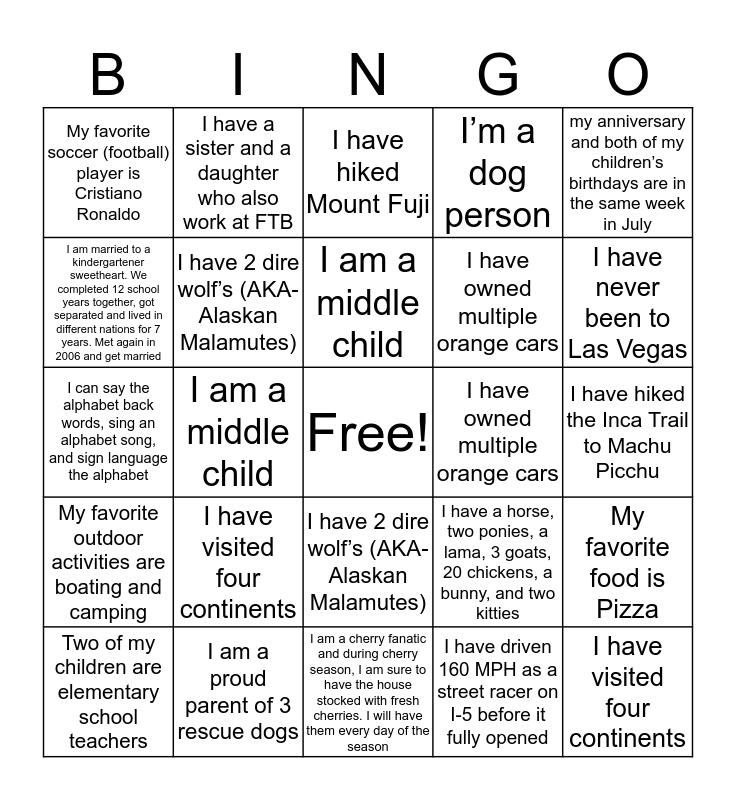 This bingo card has a free space and 24 words: Two of my children are elementary school teachers, I have visited four continents, I am a middle child, I have driven 160 MPH as a street racer on I-5 before it fully opened, my anniversary and both of my children’s birthdays are in the same week in July, My favorite soccer (football) player is Cristiano Ronaldo, I have a sister and a daughter who also work at FTB, I have hiked Mount Fuji, I have owned multiple orange cars, I have hiked the Inca Trail to Machu Picchu, I can say the alphabet back words, sing an alphabet song, and sign language the alphabet, I have 2 dire wolf’s (AKA- Alaskan Malamutes), I have a horse, two ponies, a lama, 3 goats, 20 chickens, a bunny, and two kitties, My favorite food is Pizza, I am married to a kindergartener sweetheart. We completed 12 school years together, got separated and lived in different nations for 7 years. Met again in 2006 and get married, I am a proud parent of 3 rescue dogs, I am a cherry fanatic and during cherry season, I am sure to have the house stocked with fresh cherries. I will have them every day of the season, I’m a dog person, I have never been to Las Vegas, My favorite outdoor activities are boating and camping, I am a middle child, I have 2 dire wolf’s (AKA- Alaskan Malamutes), I have owned multiple orange cars and I have visited four continents.