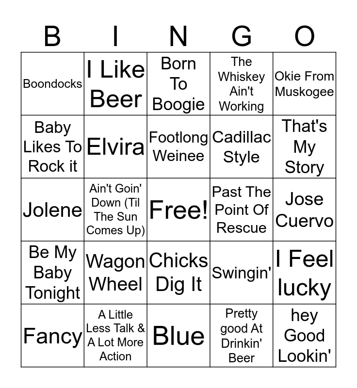 This bingo card has a free space and 75 words: Bubba Shot The Juke Box, Devil Went Down To Georgia, Born To Boogie, A Country Boy Can Survive, Lifestyles Of The Not So Rich & Famous, Somethin' In The Water, Pray For You, Dixieland Delight, Good Little Girls, Legend Of Wooley Swamp, I Don't Even Know Your name, Attitude Adjustment, Footlong Weinee, Baby Likes To Rock it, Drink Drank Drunk, Ain't Goin' Down (Til The Sun Comes Up), Kaw-Liga, hey Good Lookin', Ring Of Fire, Okie From Muskogee, You never Even Called Me By my name, Jolene, Elvira, I Like Beer, The Whiskey Ain't Working, Family Tradition, Honky Tonk Man, Louisiana Saturday Night, Rock My World, Long Haired Country Boy, Watermelon Crawl, If I Could Make A Living, The Fireman, Swingin', That's My Story, Cadillac Style, Money In The Bank, If I Said You Have A Beautiful Body, Jose Cuervo, Pretty good At Drinkin' Beer, 5-1-5-0, Red Solo Cup, The More I Drink, Friends In Low Places, Ol' Red, Some beach, Fancy, Boondocks, All Jacked Up, Dust On The Bottle, Hold My beer, Chicks Dig It, Before he Cheats, Snapback, Guys Like Me, Better Class Of Losers, Drink Swear Steal & Lie, Hillbilly bone, Lightning Does The Work, Save Water Drink Beer, Wagon Wheel, Are You Gonna Kiss Me Or Not, H.O.L.Y, John Deere Green, Meet In The Middle, Past The Point Of Rescue, Goin' Through the Big D, Beer For My Horses, Drinkin' Bone, I Feel lucky, Be My Baby Tonight, A Little Less Talk & A Lot More Action, You Ain't Much Fun, Blue and Did I Shave My Legs For This?.