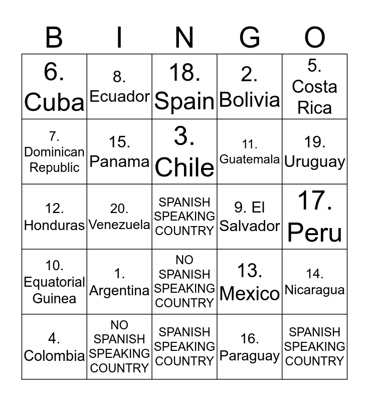 This bingo card has a free space and 24 words: 1. Argentina, NO SPANISH SPEAKING COUNTRY, 3. Chile, 4. Colombia, 5. Costa Rica, 6. Cuba, 7. Dominican Republic, 8. Ecuador, 9. El Salvador, NO SPANISH SPEAKING COUNTRY, 11. Guatemala, 12. Honduras, 13. Mexico, 14. Nicaragua, 15. Panama, 16. Paraguay, 17. Peru, 18. Spain, 19. Uruguay, 20. Venezuela, SPANISH SPEAKING COUNTRY, 10. Equatorial Guinea, 2. Bolivia and SPANISH SPEAKING COUNTRY.