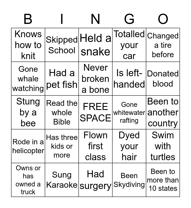 This bingo card has a free space and 24 words: Owns or has owned a truck, Has three kids or more, Never broken a bone, Been Skydiving, Changed a tire before, Knows how to knit, Skipped School, Held a snake, Gone whitewater rafting, Been to another country, Stung by a bee, Had a pet fish, Dyed your hair, Swim with turtles, Gone whale watching, Sung Karaoke, Had surgery, Totalled your car, Donated blood, Rode in a helicopter, Read the whole Bible, Flown first class, Is left-handed and Been to more than 10 states.
