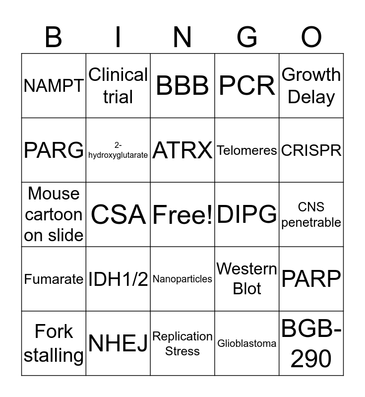 This bingo card has a free space and 42 words: Synthetic Lethality, ATRX, MGMT, IDH1/2, Glioblastoma, PARP, BGB-290, Exquisite Sensitivity, BBB, Nanoparticles, CNS penetrable, CRISPR, CSA, Growth Delay, Foci, Western Blot, yH2AX, Mouse cartoon on slide, Bench-to-bedside, Clinical trial, PARG, PPM1D, K27M, NAMPT, NAPRT, MMR proteins, Telomeres, Temozolomide, ATRi, Synergy Assay, Collaborate, Fumarate, 2-hydroxyglutarate, Replication Stress, DNA repair, Fork stalling, NHEJ, DIPG, HR, Resection, PCR and ChIP-seq.