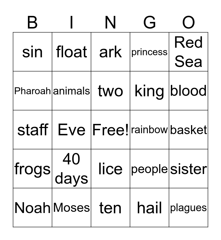 This bingo card has a free space and 29 words: Noah, Adam, Eve, flood, sin, ark, animals, 40 days, rainbow, Moses, basket, plagues, ten, hail, blood, flies, lice, frogs, Red Sea, staff, people, Hebrews, king, Pharoah, princess, float, sister, two and build.
