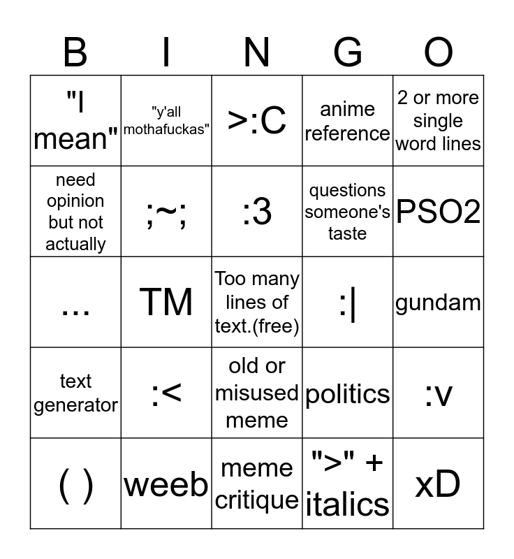 This bingo card has a free space and 24 words: :<, weeb, :3, ( ), 2 or more single word lines, "I mean", need opinion but not actually, "y'all mothafuckas", :|, old or misused meme, questions someone's taste, ..., politics, :v, ;~;, ">" + italics, gundam, >:C, PSO2, TM, xD, text generator, anime reference and meme critique.