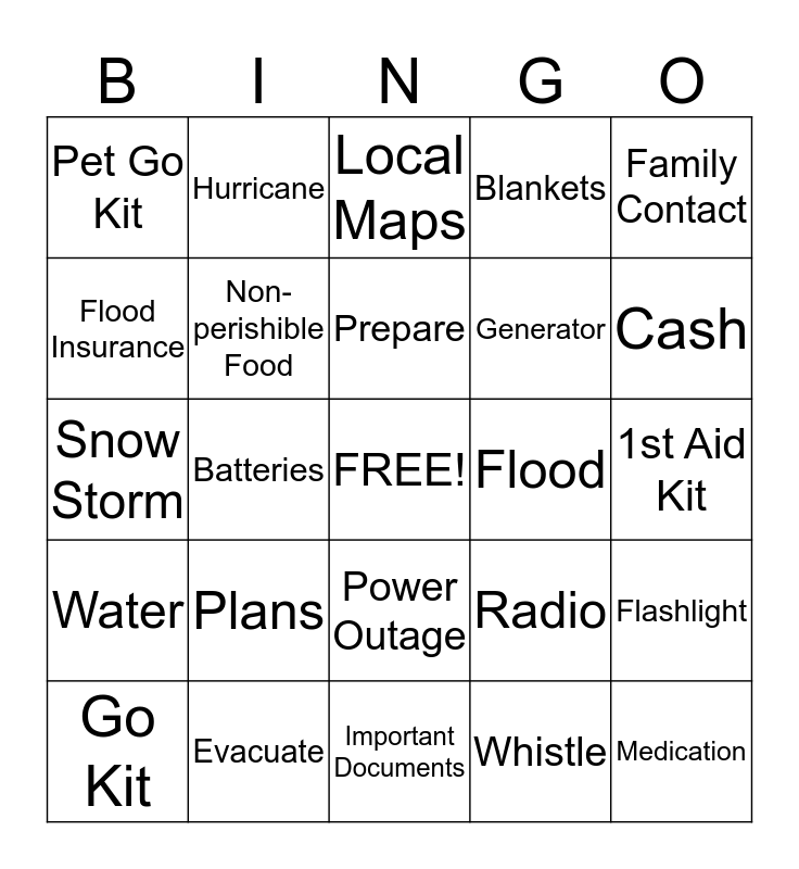This bingo card has a free space and 24 words: Plans, Evacuate, Prepare, Go Kit, Family Contact, Pet Go Kit, Flood Insurance, Hurricane, Flood, Power Outage, Generator, Snow Storm, Radio, Flashlight, Non-perishible Food, Whistle, 1st Aid Kit, Local Maps, Cash, Batteries, Medication, Water, Blankets and Important Documents.