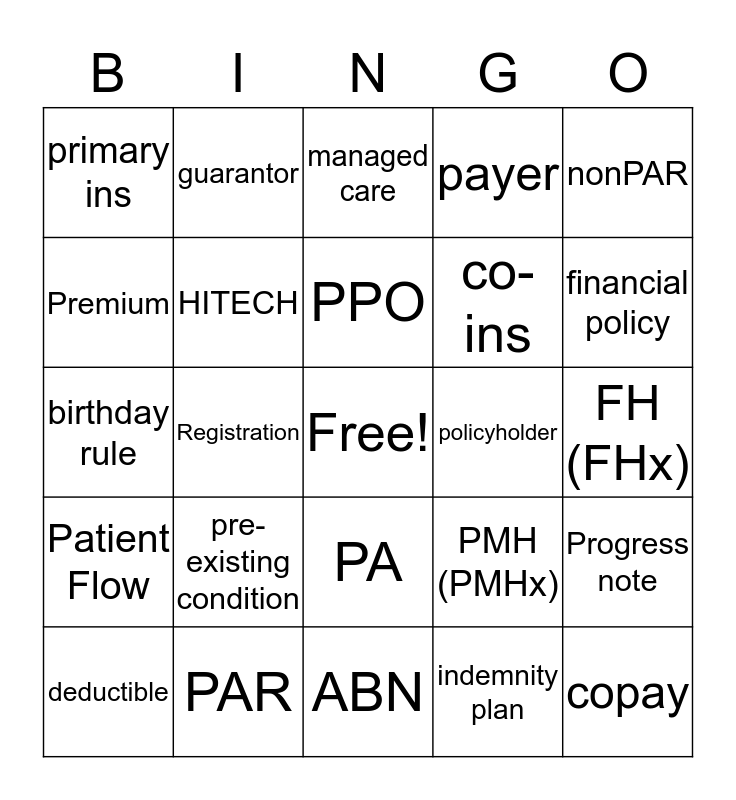 This bingo card has a free space and 44 words: Benefits, copay, covered services, deductible, EP, indemnity plan, managed care, NP, nonPAR, PAR, payer, policyholder, PA, pre-existing condition, referral number, ABN, accept assignment, birthday rule, COB, financial policy, guarantor, pt information form, pt tracking feature, primary ins, secondary ins, FH (FHx), HPI, PFSH (PFSHx), PMH (PMHx), Patient Flow, Clinical Work Flow, Progress note, ROS, SH (SHx), Registration, TPO, CLIA, HMO, PPO, Premium, co-ins, pt portal, HITECH and HIPAA.