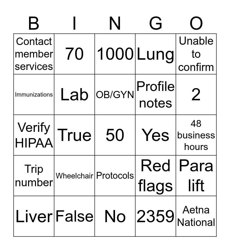 This bingo card has 30 words: False, Will call, True, Return ride, Contact member services, 1000, Lab, Protocols, Yes, No, 48 business hours, 50, 2359, Aetna National, 2, 1, Red flags, Trip number, Wheelchair, Unable to confirm, Verify HIPAA, 30, 70, Profile notes, Immunizations, Lung, Para lift, Liver, OB/GYN and 10.